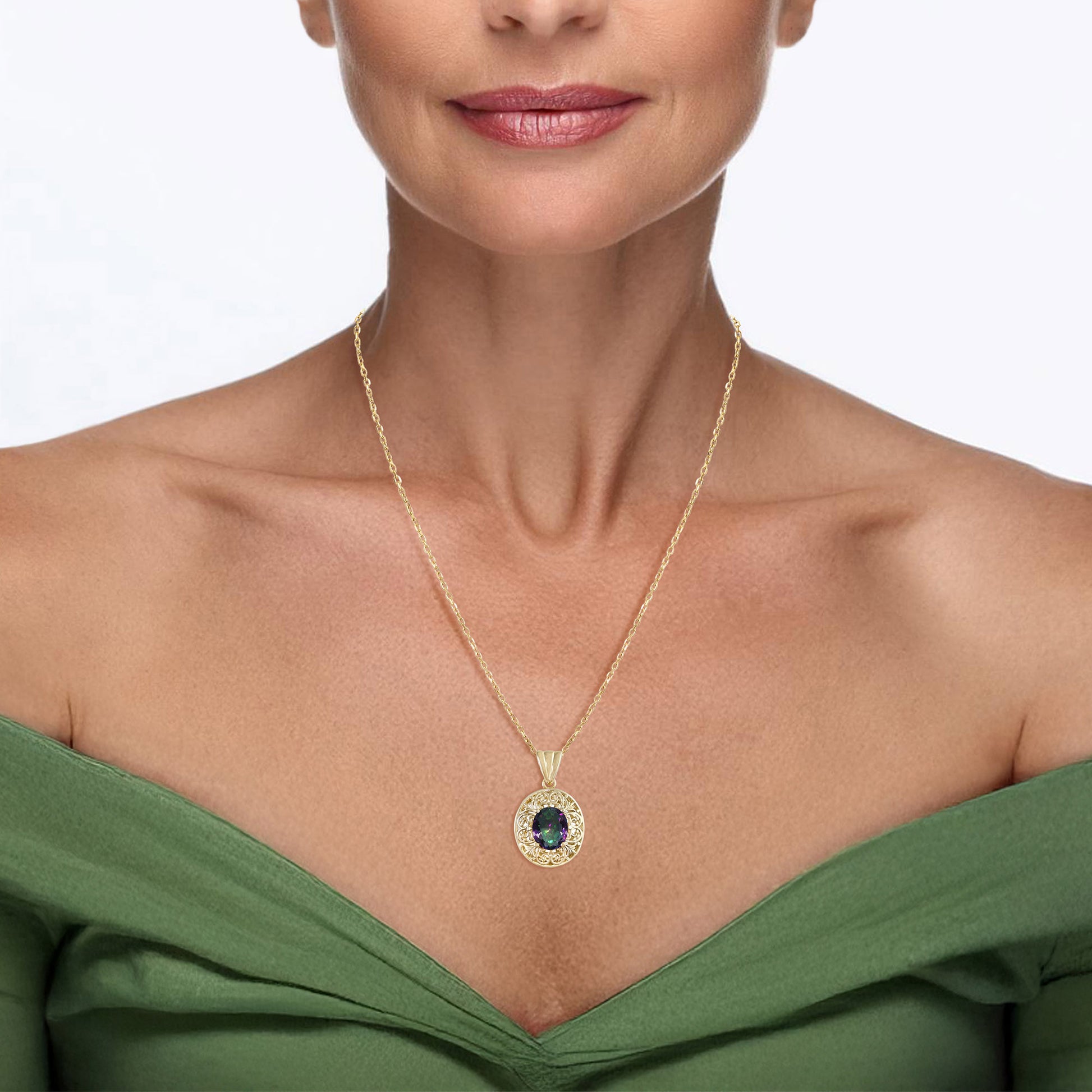 This ornate filigree pendant captures timeless beauty with a bold centerpiece of Zultanite-colored genuine quartz. Crafted by our master artisans in Istanbul, the 10x12 mm oval quartz is created through a proprietary color-enhancement technique, producing captivating shifts of green, pink, and gold tones. The intricate filigree frame adds depth and elegance, making this pendant a versatile statement piece.