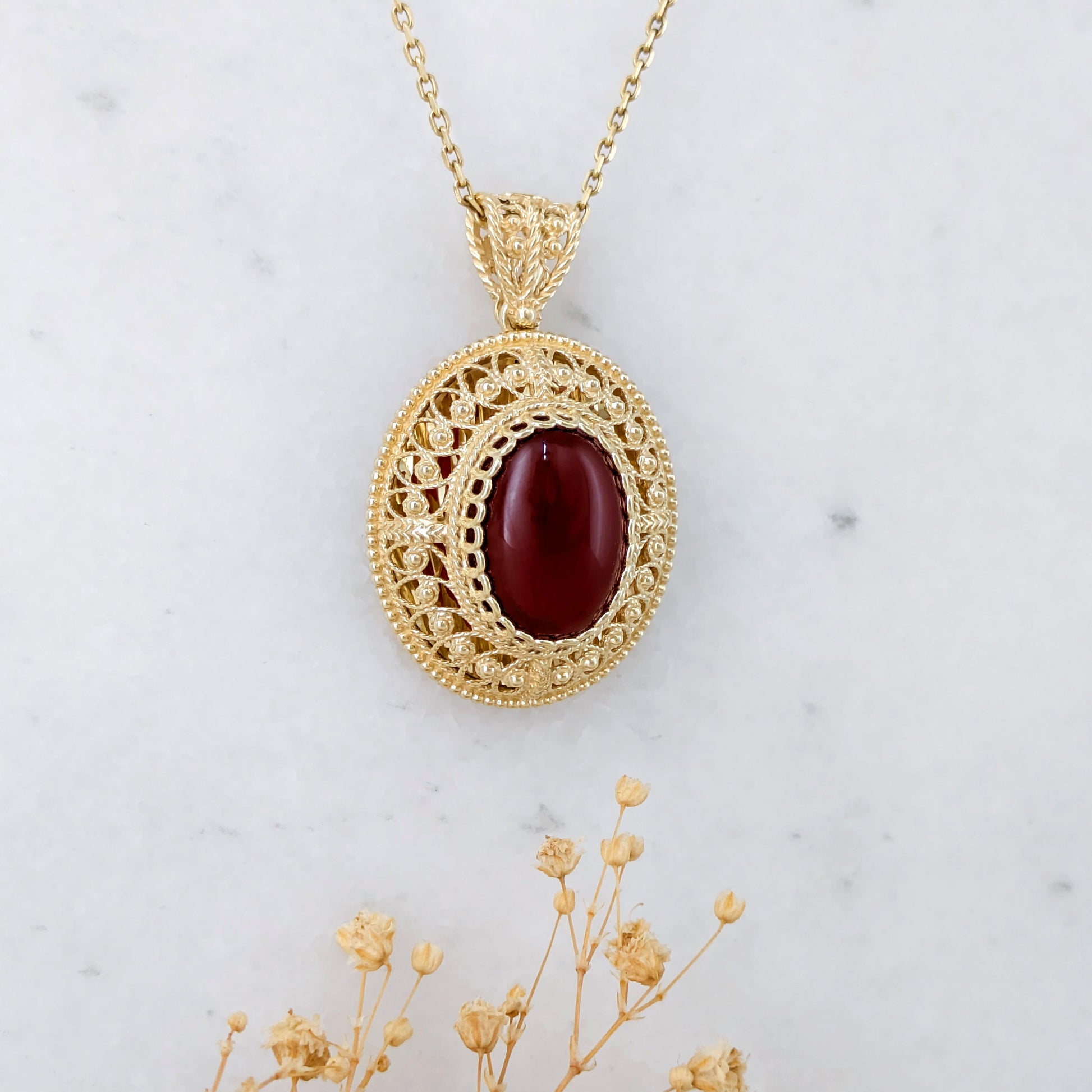 Make a bold statement with this exquisite Gold Filigree Pendant, featuring a genuine 13x18mm carnelian gemstone. The intricate handcrafted filigree design adds a vintage-inspired touch, while the diamond-cut mirror finish inside brings extra shine and elegance. Whether you're looking to elevate your everyday style or searching for a unique gift, this artisan pendant is a timeless piece that adds luxury to any necklace.
