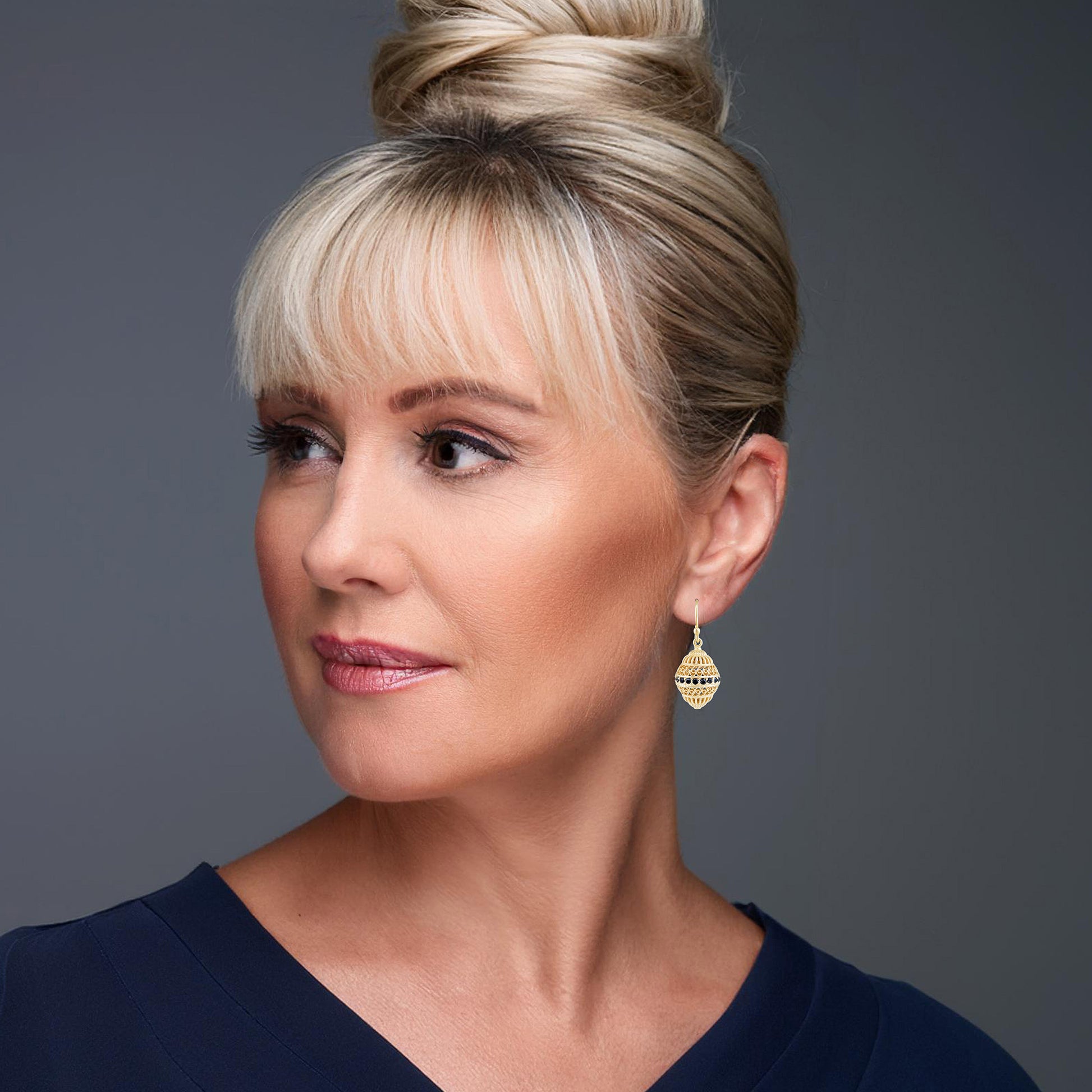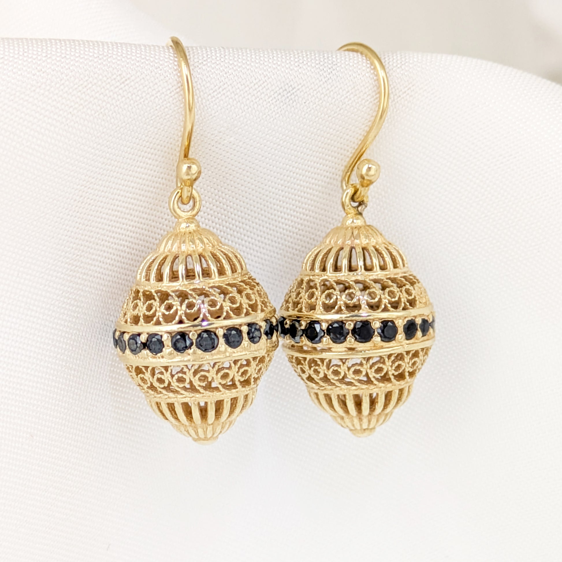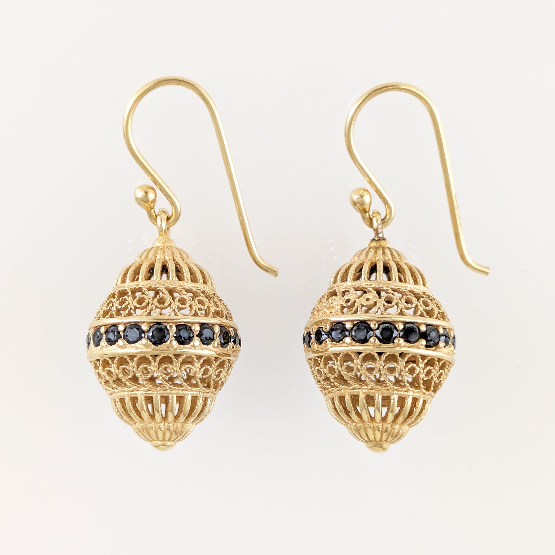 Handcrafted in Istanbul, these filigree drop earrings feature a sculptural openwork globe accented with a ring of brilliant-cut Black Spinel.The detailed latticework creates depth and dimension, while the polished golden finish enhances each curve. Lightweight yet richly textured, they bring handmade elegance and refined sparkle to any jewelry collection.
