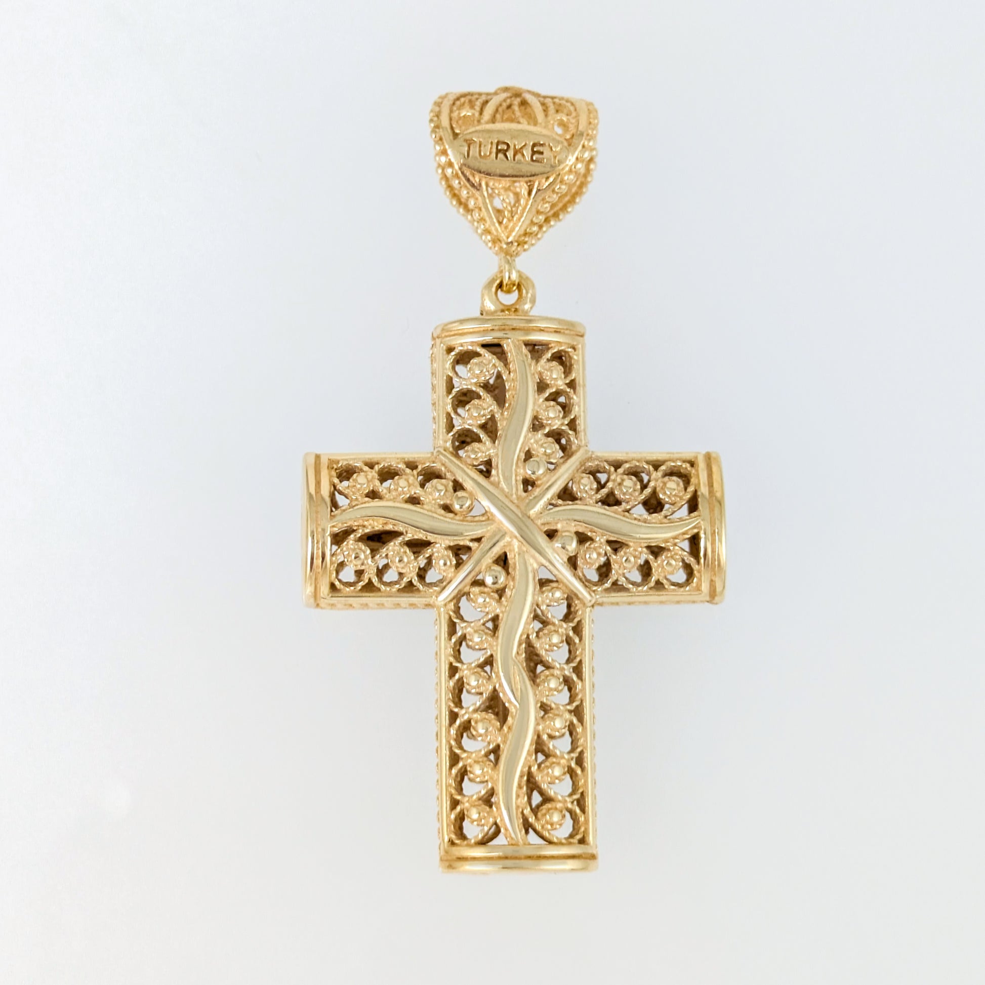 This reversible cross pendant brings two distinct looks together in one beautifully crafted design from Istanbul. One side displays a polished star framed by intricate scrollwork, while the opposite side shows an elegant flowing-line motif. The openwork design adds depth and light, creating a symbolic and versatile pendant that blends meaning with refined craftsmanship.