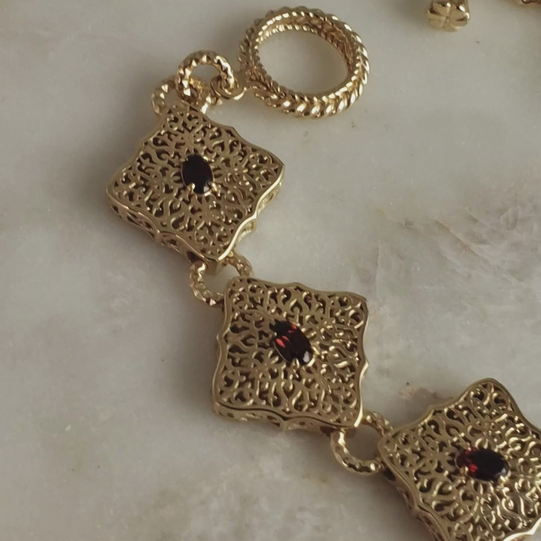 Elevate your style with our meticulously crafted Scrollwork Gemstone Bracelet, a true embodiment of luxury and intricate design. Each panel of this bracelet is a masterpiece of craftsmanship, boasting intricate scrollwork that creates an elegant and sophisticated pattern. The symmetrical design of the scrollwork panels brings a sense of balance and harmony to the bracelet's overall look.