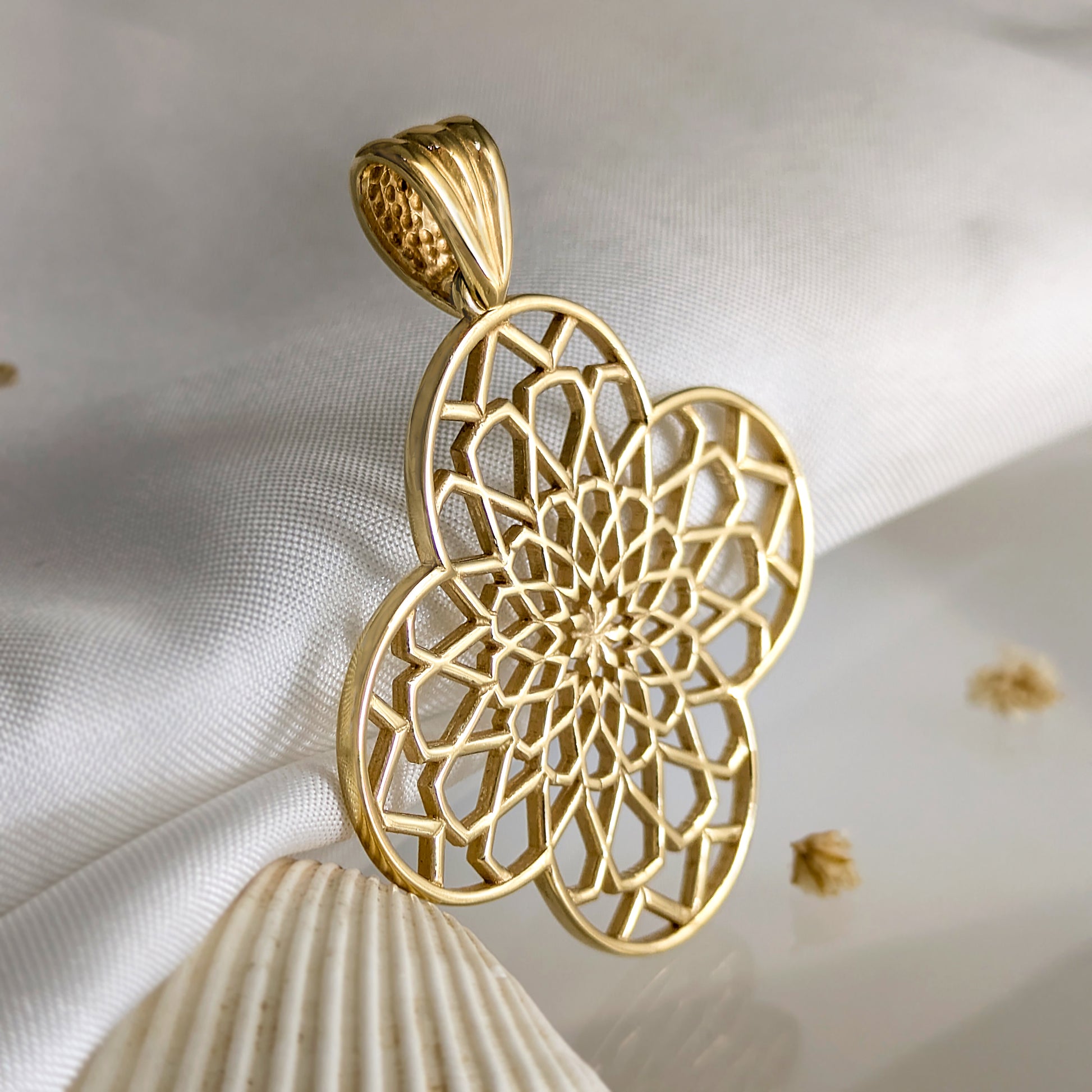 Handcrafted in Istanbul, this geometric openwork pendant draws inspiration from the intricate patterns of Seljuk architecture. Its radiating lattice design and clover silhouette echo the harmony and balance found in historic Anatolian motifs. Lightweight, luminous, and richly detailed, it brings sculptural elegance and cultural artistry to your everyday style.