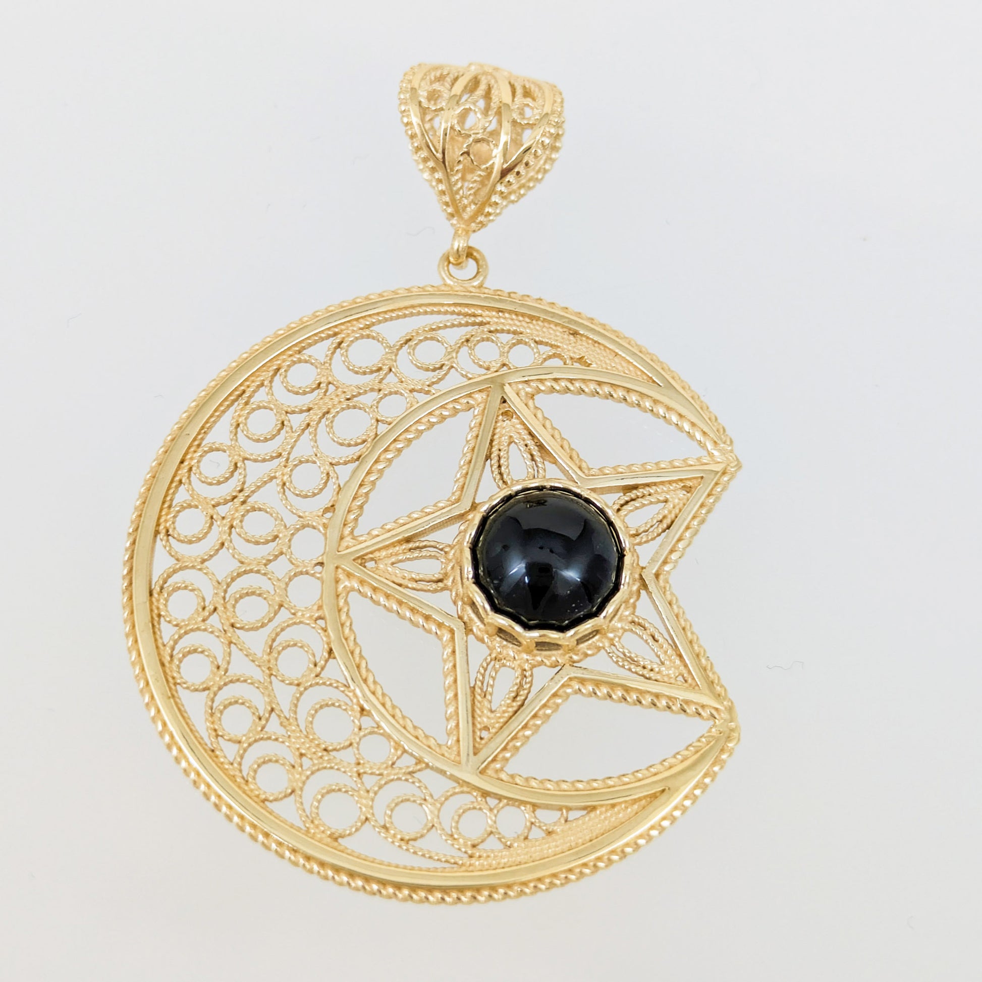 Celebrate the beauty of the cosmos with this Gold Crescent Moon and Star Pendant, featuring a striking 8mm black onyx gemstone. Handcrafted with intricate filigree work, this pendant showcases the celestial harmony of the crescent moon and star, symbolizing guidance and protection. Measuring 1 3/4 inches in length and 1 3/16 inches in width, this pendant makes a bold yet elegant statement.