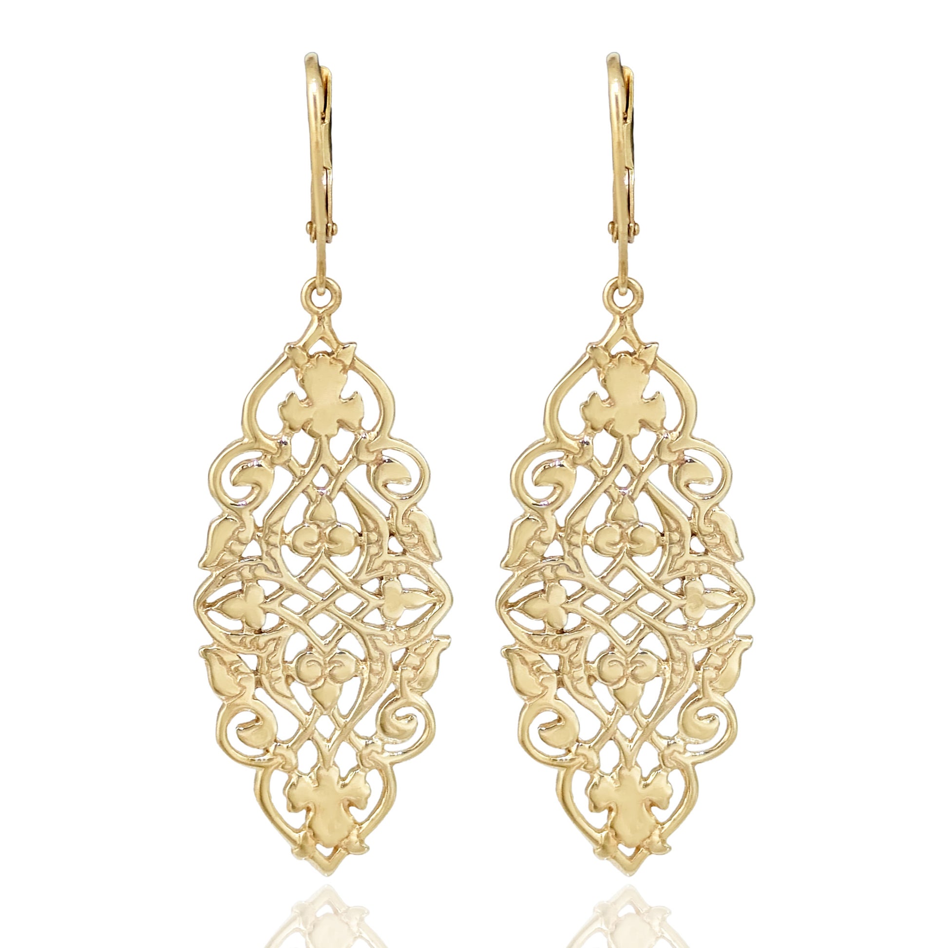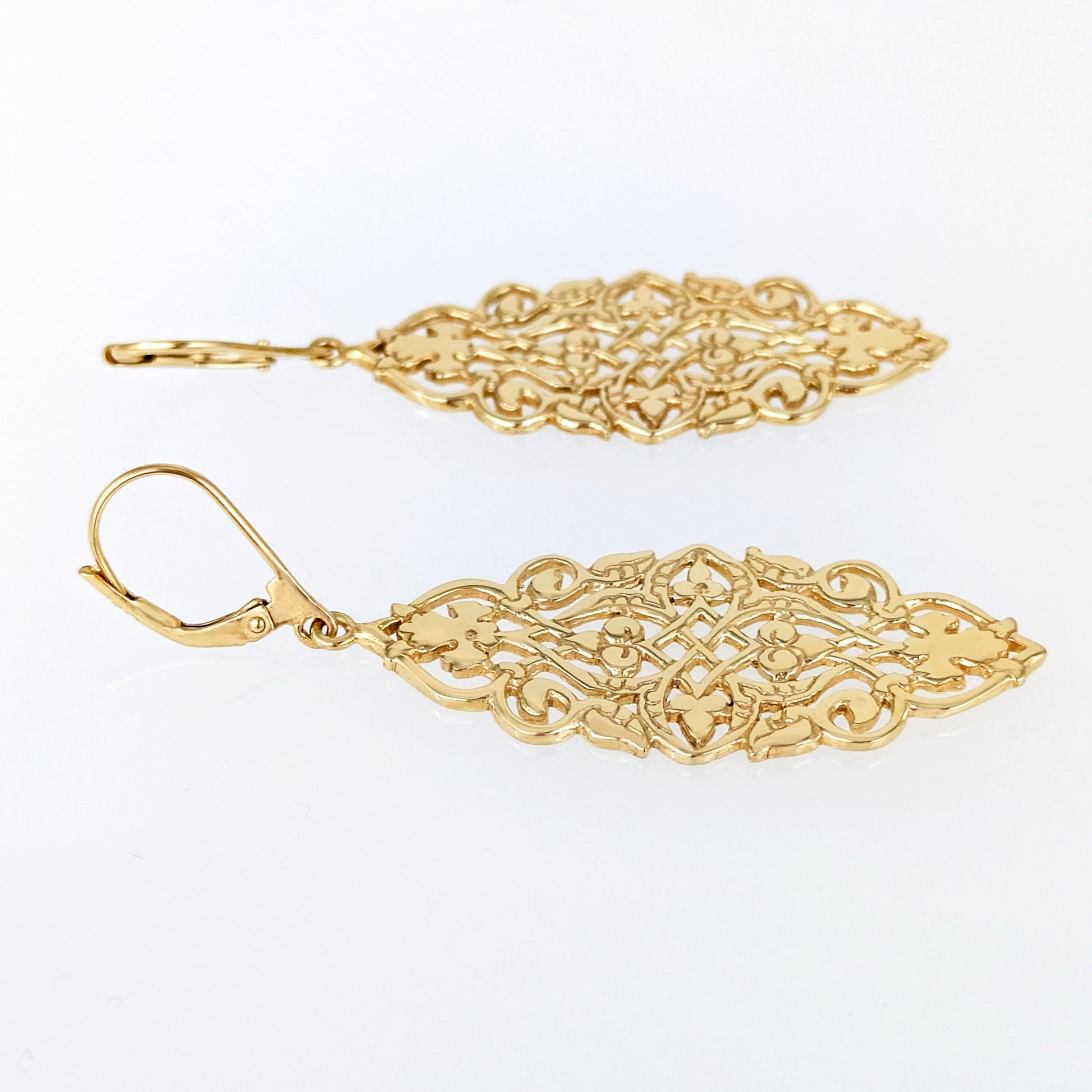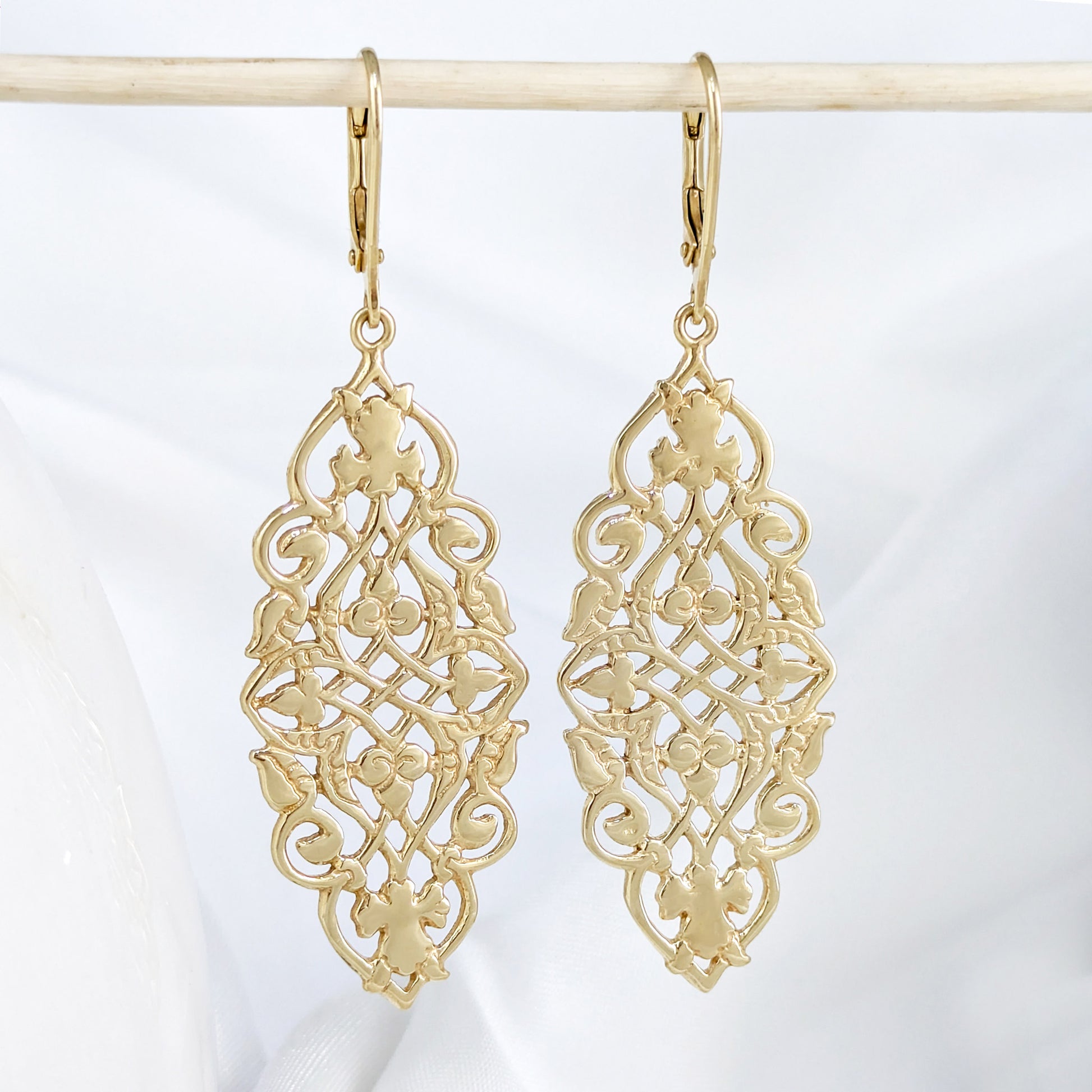 These ornate openwork earrings are handcrafted in Istanbul with an elongated drop silhouette. Flowing curves, leaf motifs, and intricate lattice elements create a sculptural, radiant look. Lightweight yet detailed, they add refined elegance to both everyday and special-occasion style.