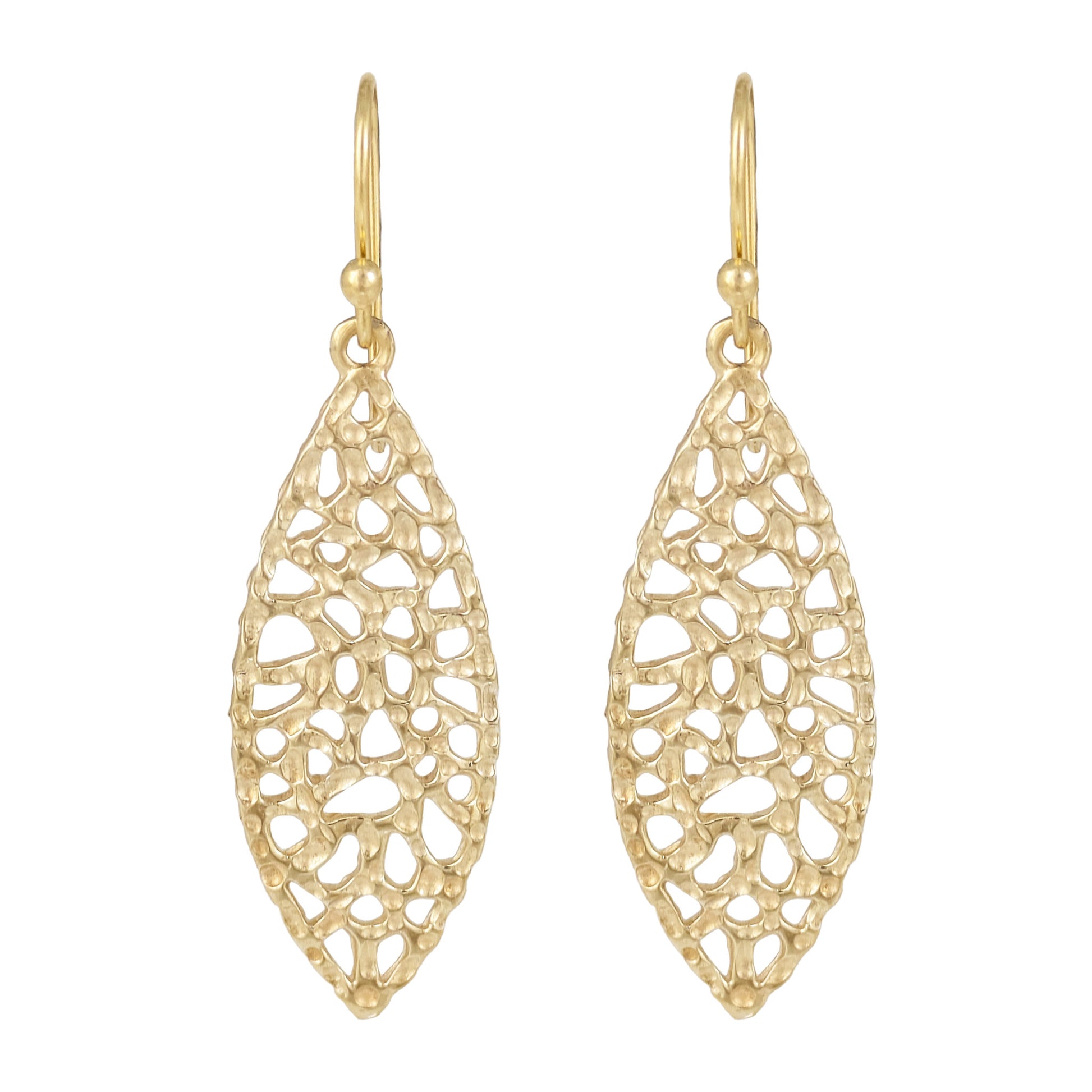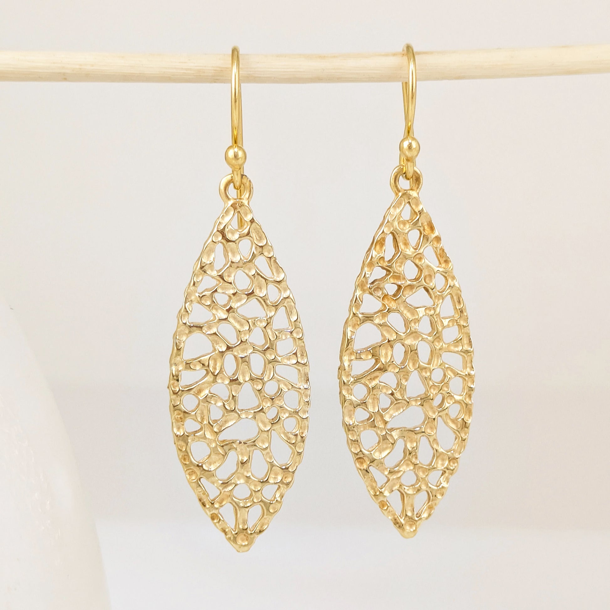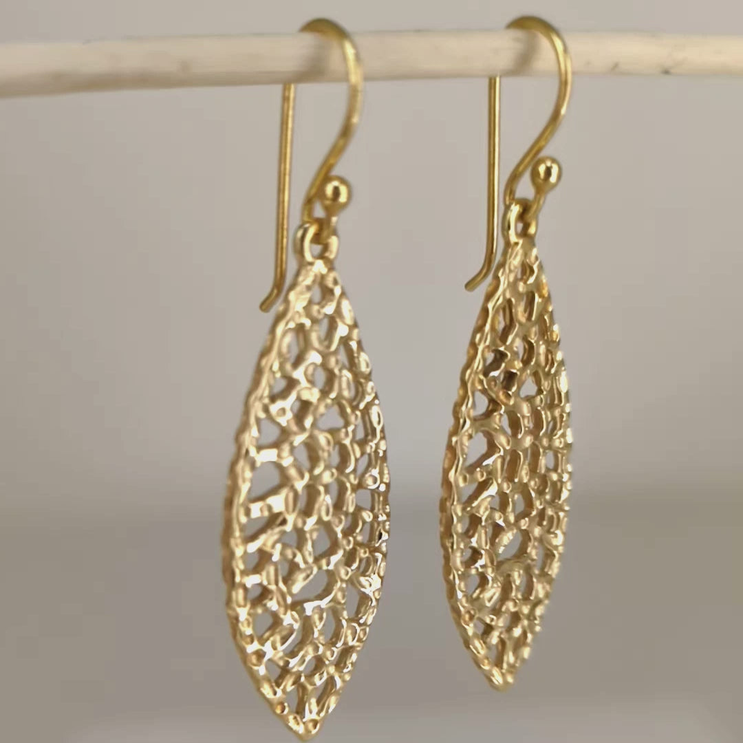 Handcrafted in Istanbul, these organic openwork drop earrings feature a sculptural, free-form texture inspired by natural patterns. Their airy, elongated silhouette creates graceful movement, while the polished golden finish adds refined luminosity. Lightweight and expressive, they bring modern artistry and elevated everyday style together in a versatile design.