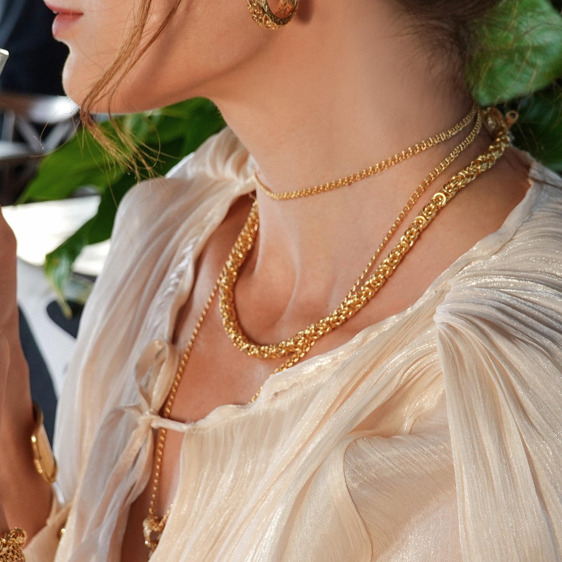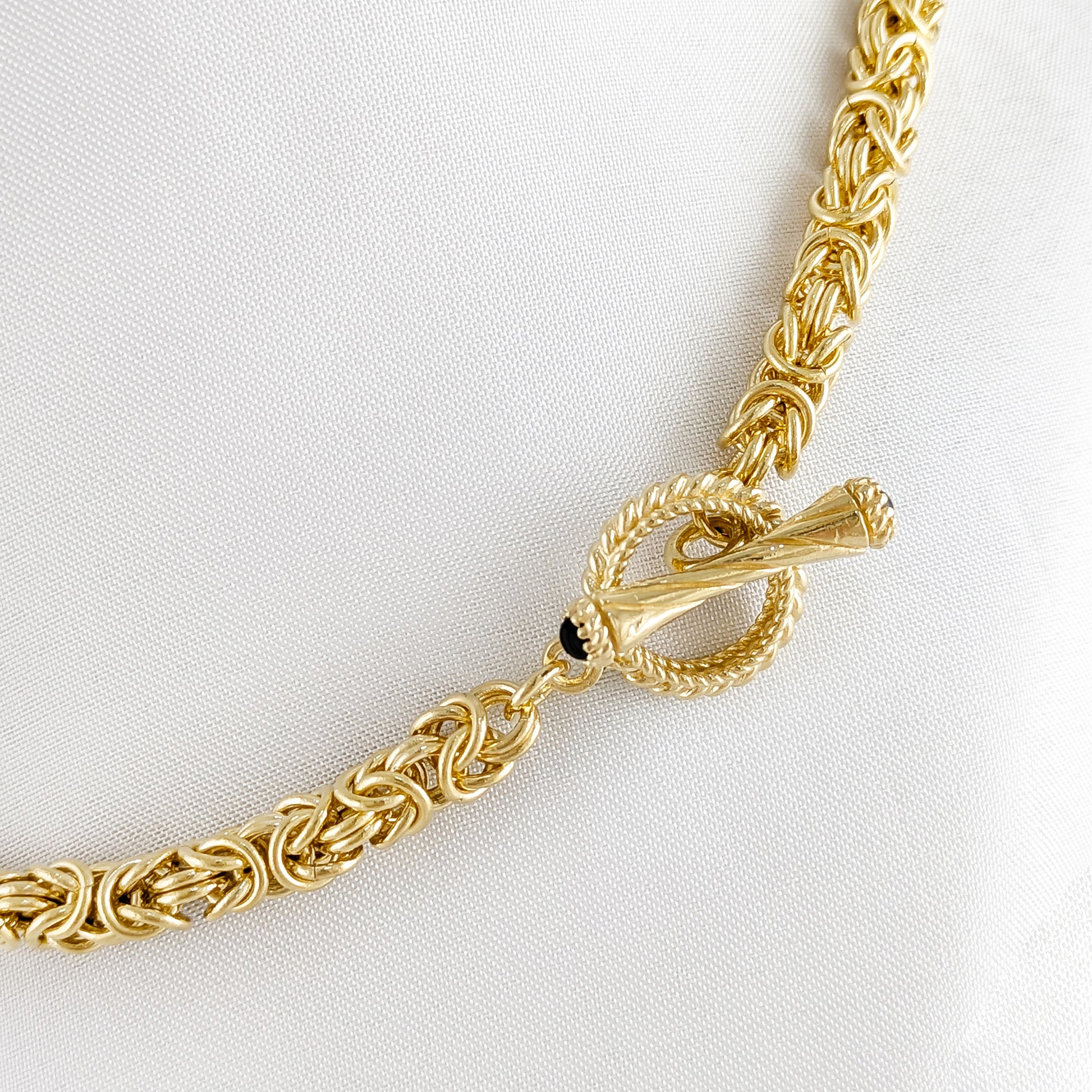 Our signature Byzantine chain is richly textured and woven with care by master artisans in Istanbul. Each link interlocks seamlessly to create a flexible, dimensional chain that drapes effortlessly. The toggle clasp is detailed with a twisted design and black tip accent, balancing strength with ornament. Finished in luminous 18k gold over bronze, this necklace is offered in a range of lengths to suit any layering style or statement preference.